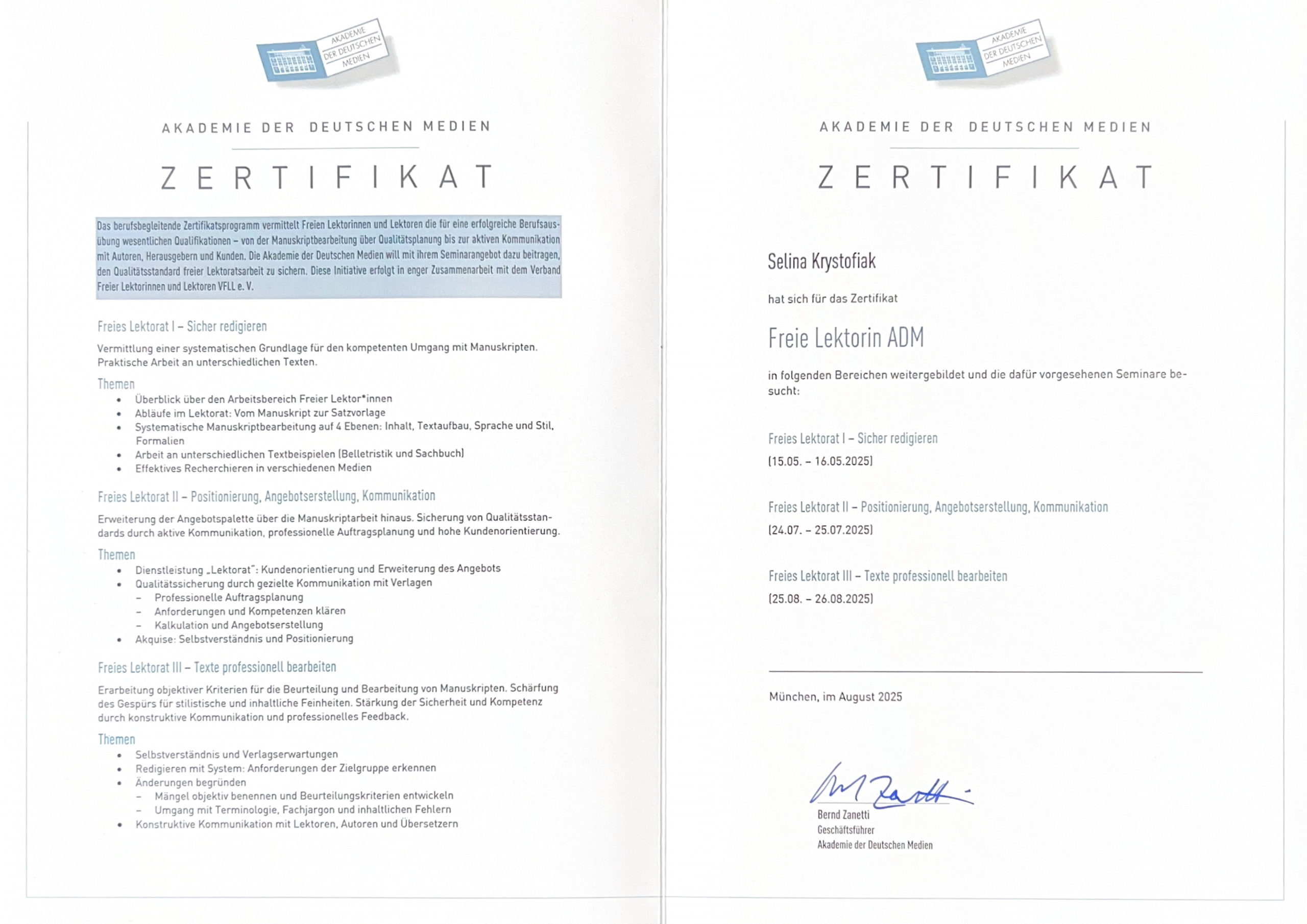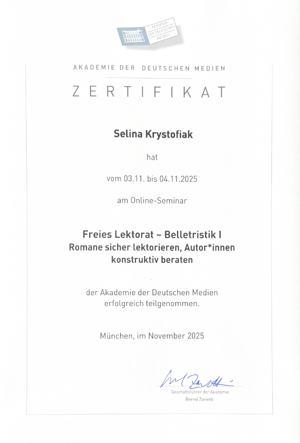 Ich arbeite seit Jahren im Marketing-, PR- und Social-Media-Bereich und konnte mir dort eine professionelle stilistische und inhaltliche Arbeitsweise aneignen. Neben einem Praktikum im Lektorat und den Weiterbildungen der Akademie der Deutschen Medien als zertifizierte freie Lektorin schaue ich mittlerweile auf über zweieinhalb Jahre Arbeitserfahrung als freie Lektorin zurück und somit auf einige abgeschlossene Lektoratsprojekte. Dabei habe ich sowohl mit Selfpublisher:innen als auch mit Klein- und Publikumsverlagen zusammengearbeitet.
